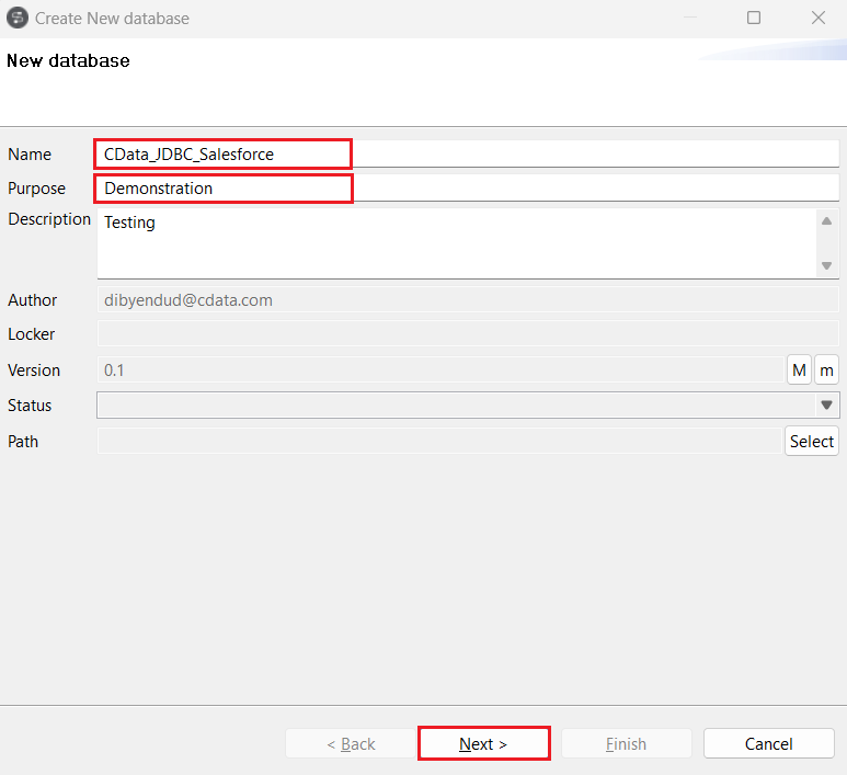 - GitHub のデータ をロードする Talend の新しいデータベースの Name、Purpose、Description を入力します。Next をクリックします。