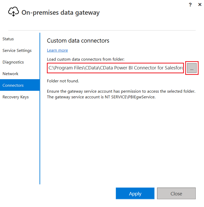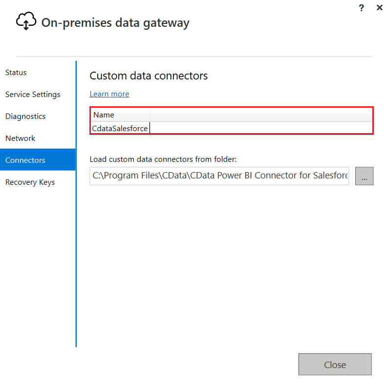 - オンプレミスデータゲートウェイを立ち上げて「コネクタ」のタブに移動し、フォルダパスから「C:\Program Files\CData\CData Power BI Connector for GitHub」を選択します。