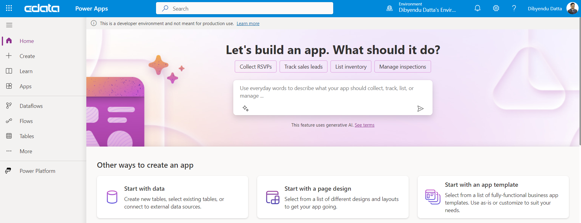 - Power Apps の環境では、モデル駆動アプリで利用できるDataverse にデータを連携するので、Dataverse の環境を予め構成しておいてください。