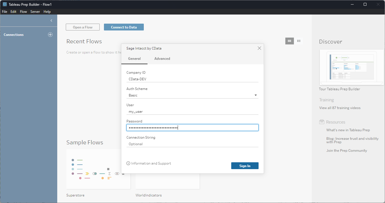 Tableau Prep Builder を開き、「データに接続」をクリックして「GitHub by CData」を検索します。接続を設定し、「サインイン」をクリックします。