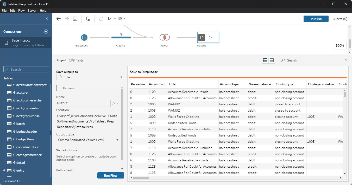 出力データが保存されたら、他のファイルソースと同様に Tableau で操作できます。