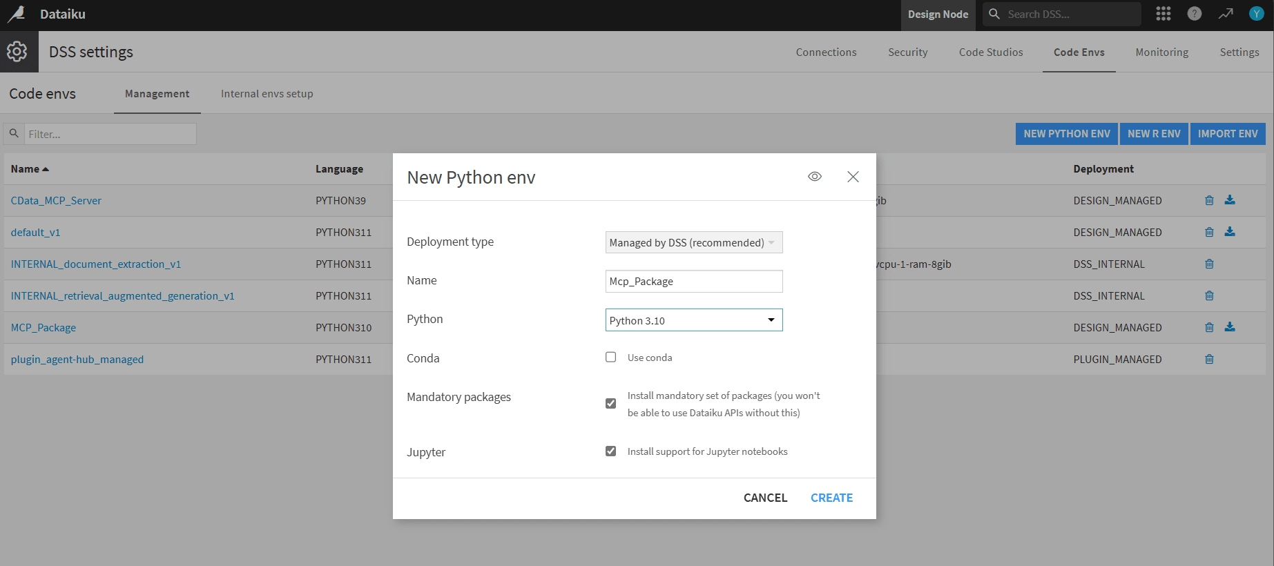 - DSS で New Python env をクリック。名前を付け(例:MCP_Package)、Python 3.10 を選択(3.10 から 3.13 がサポートされています)