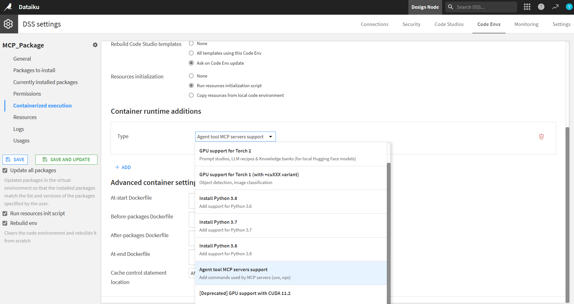 - Containerized execution を開き、Container runtime additions の下で Agent tool MCP servers support を選択