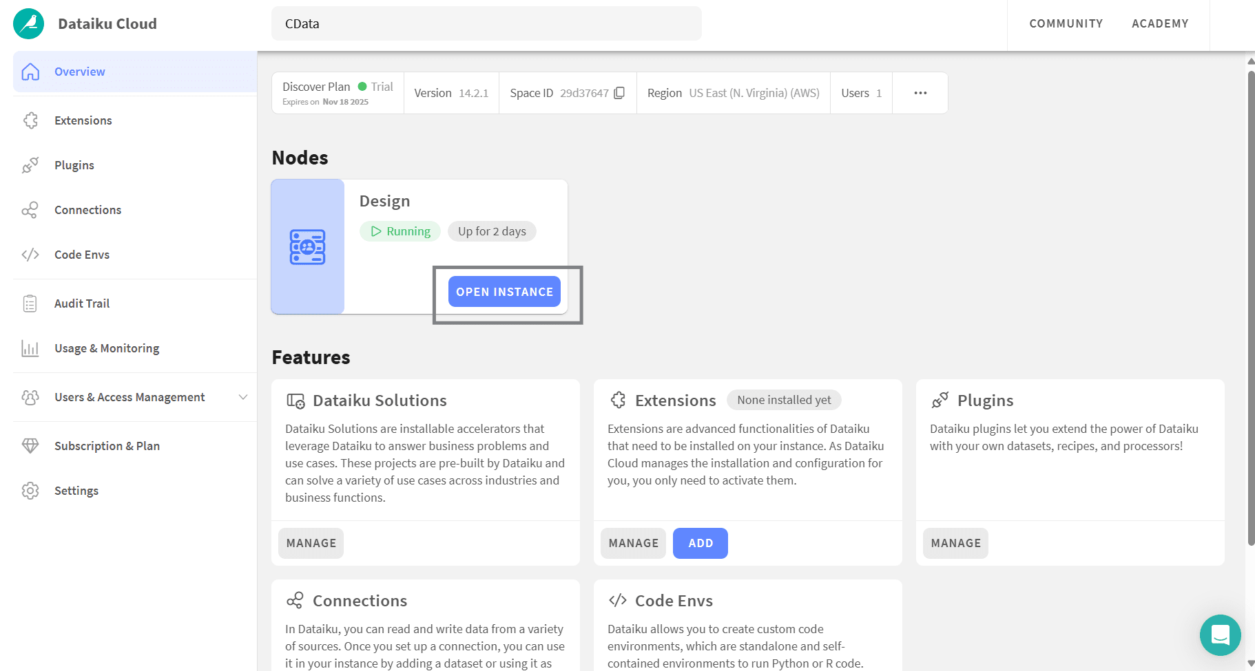 - Dataiku Cloud に戻り、Overview を開いて Open instance をクリック