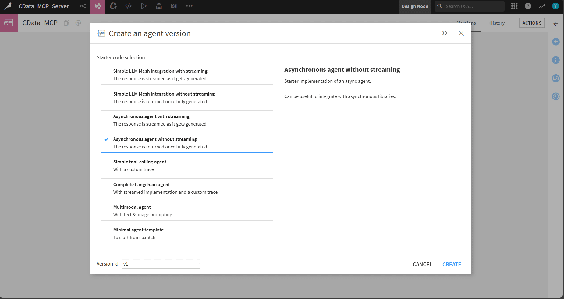 - Code agent を選択し、名前を付け、Agent version で Asynchronous agent without streaming を選択