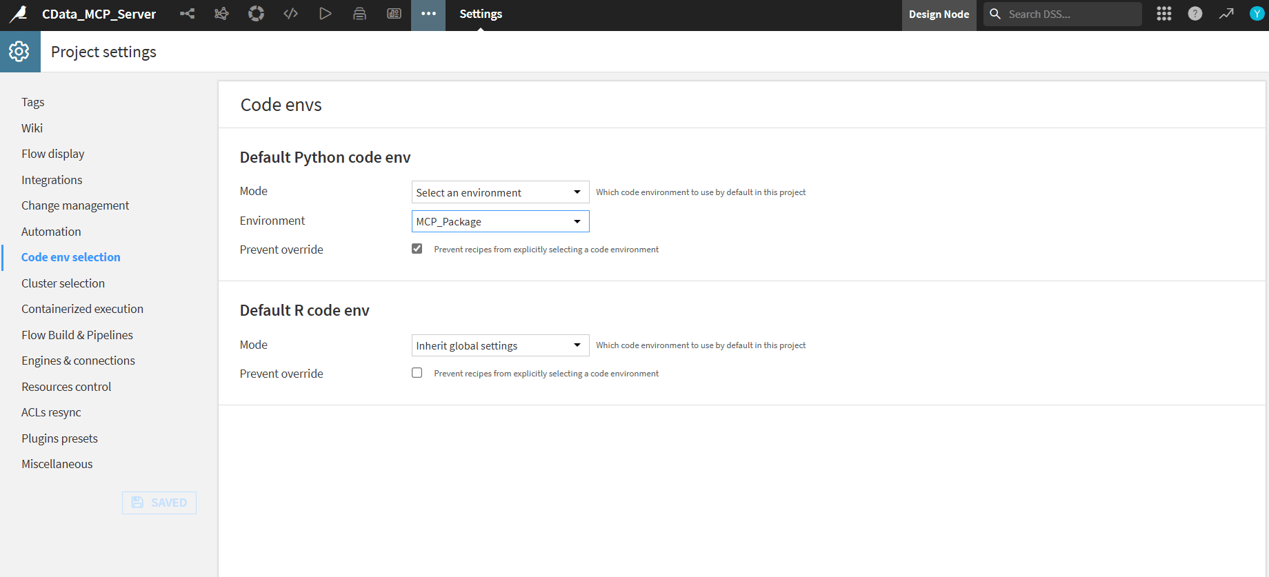 - 上部のタブから Settings を選択。Code env selection で Default Python code env を作成した環境(例:MCP_Package)に設定