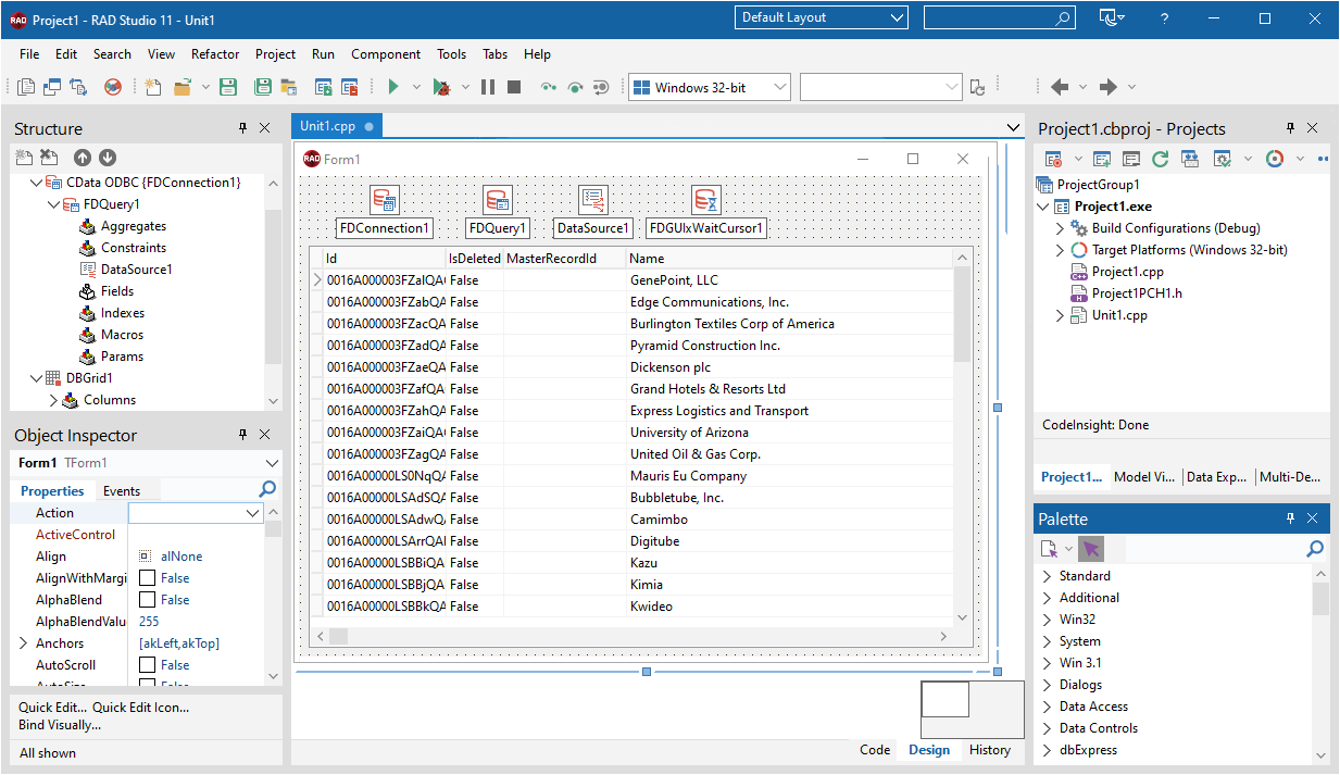 CData ODBC ドライバー for Google Cloud Storage を使用すると、C++Builder の標準データアクセスコンポーネントを使ってライブのGoogle Cloud Storage のデータ への接続を簡単に統合できます。この記事では、C++Builder でシンプルな VCL(Visual Component Library)アプリケーションを作成し、Google Cloud Storage のデータ に接続してクエリを実行し、グリッドに結果を表示する方法を説明します。さらに、FireDAC コンポーネントを使ってコードからコマンドを実行する方法も紹介します。