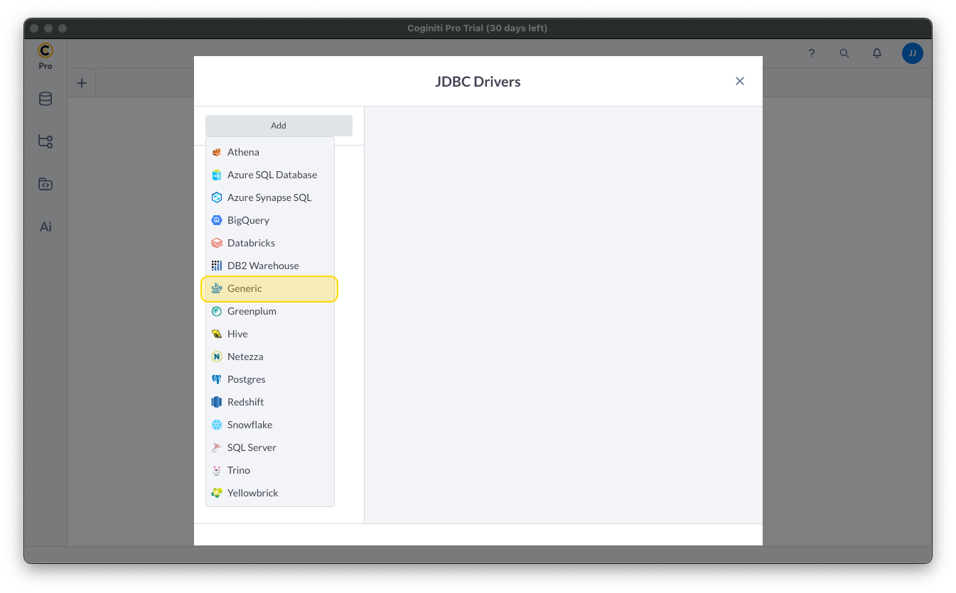 NOTE: Coginiti Pro で JDBC ドライバーを使用するには、ライセンス(製品版またはトライアル版)とランタイムキー(RTK)が必要な場合があります。ライセンス(またはトライアル)の取得について詳しくは、営業チームまでお問い合わせください。
