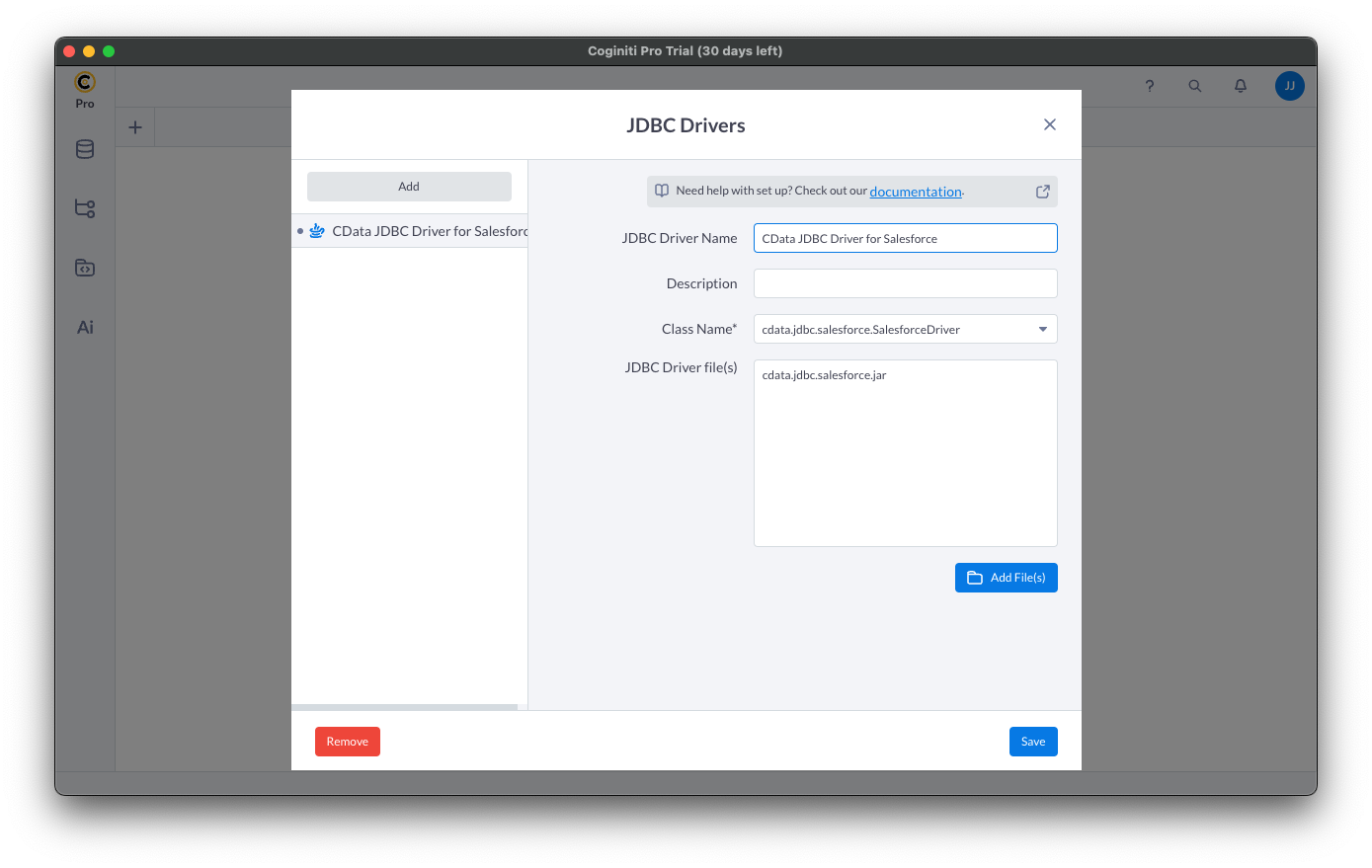 - 「Add Files」をクリックして、インストールディレクトリの「lib」フォルダから JAR ファイル(例:cdata.jdbc.greenhouse.jar)を追加します。