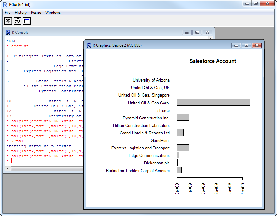 par(las=2,ps=10,mar=c(5,15,4,2)) barplot(customers$Price, main="HBase Customers", names.arg = customers$CustomerName, horiz=TRUE)