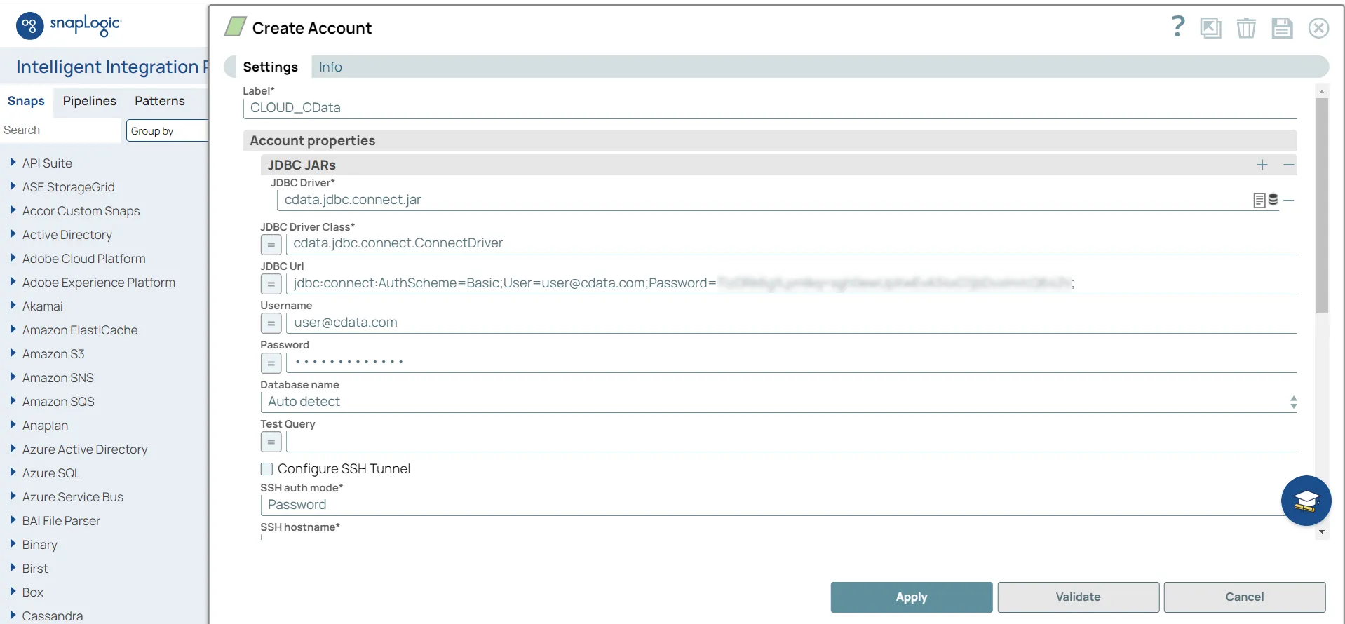 - Validate をクリックします。接続が成功すると、「snap」が使用可能になります。