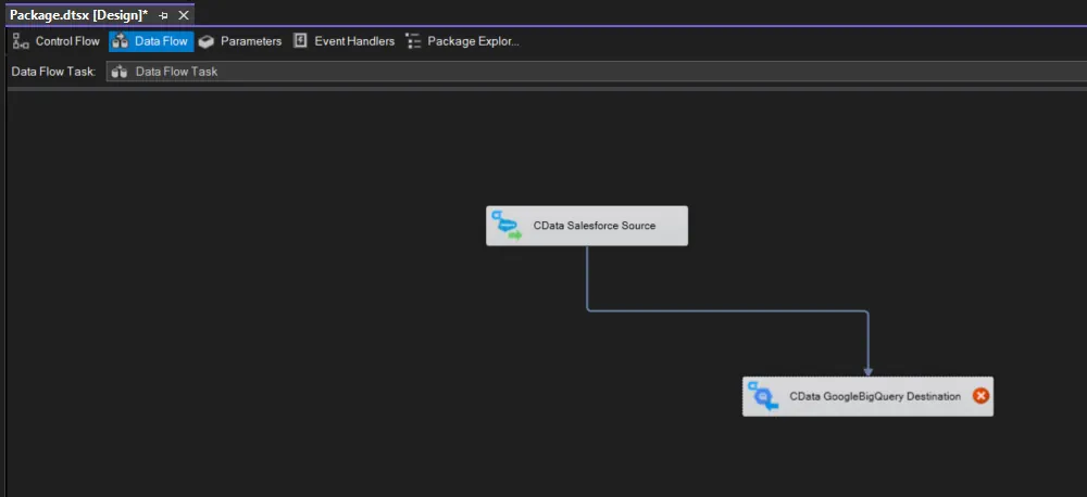 Data Flow Task に CData IBM Cloud Object Storage Source コントロールと CData GoogleBigQuery Destination コントロールを追加します。