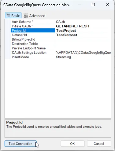 CData GoogleBigQuery Connection Manager で接続プロパティを設定し、接続をテストして保存します。