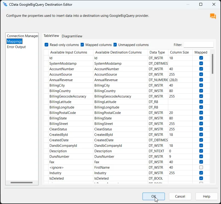 - Google BigQuery では、NUMERIC 型は 38 桁の精度と小数点以下最大 9 桁をサポートし、BIGNUMERIC 型は 76 桁の精度と小数点以下最大 38 桁をサポートします。CData SSIS Components for Google BigQuery は精度/スケールを自動検出しますが、Destination コンポーネントでは高精度カラムを手動でマッピングできます。