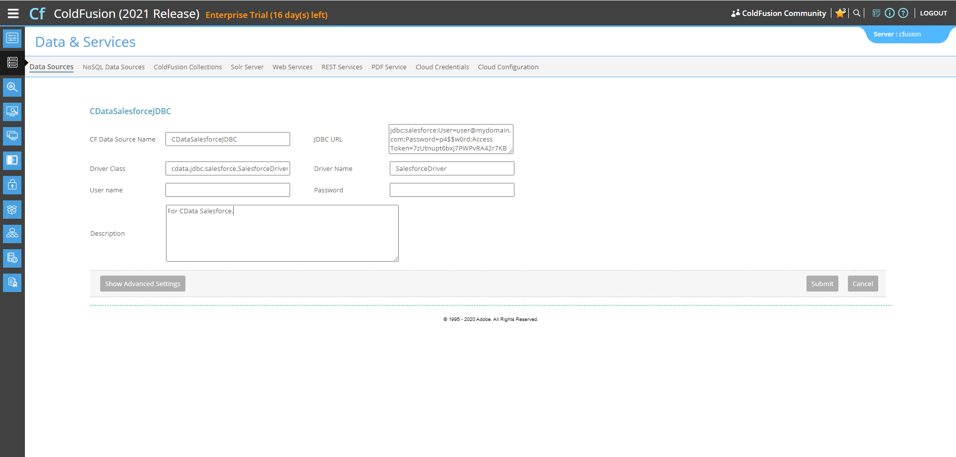 ColdFusion と Instagram 間の接続を確立するには、JDBC 接続文字列が必要です。