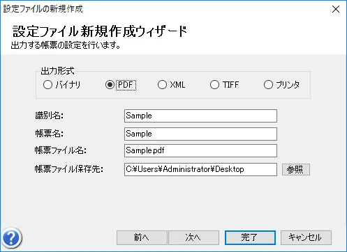 - 次に任意の出力設定を入力し「完了」をクリックします。