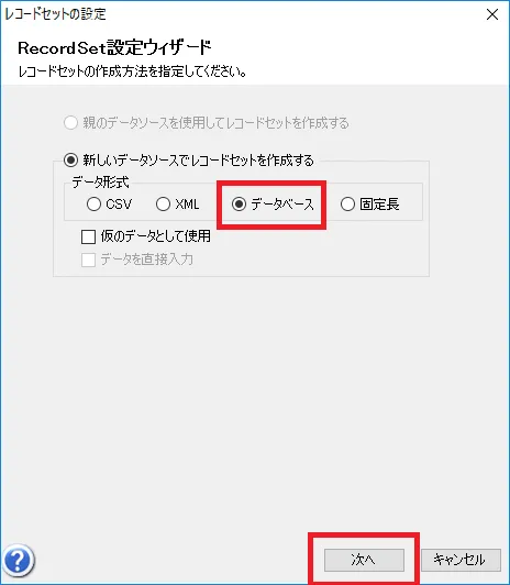 - このダイアログでCData ODBC ドライバからのデータ取得設定を行っていきます。「新しいデータソースでレコードセットを作成する」の中から「データベース」を選択し、「次へ」をクリックすると