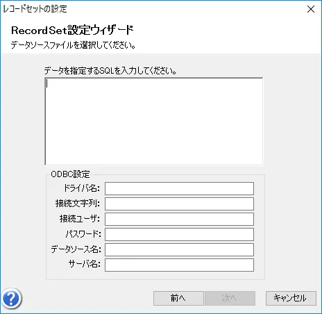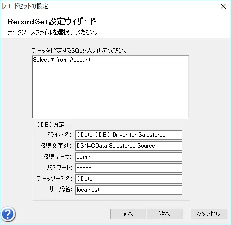 - データ取得実行時のSQL とODBC Datasource に接続するための各種プロパティ入力画面が表示されるので、下記のとおり入力を行います。