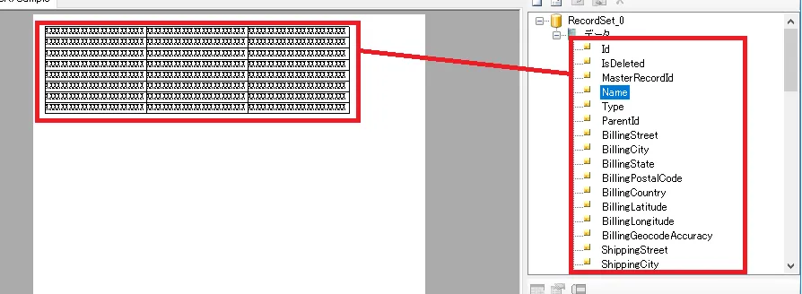 - 明細リストとして設定すると、各行に対してレコードセットをマッピングすることができるようになります。ドラッグアンドドロップで、レコードセットから各カラムを紐づけます。