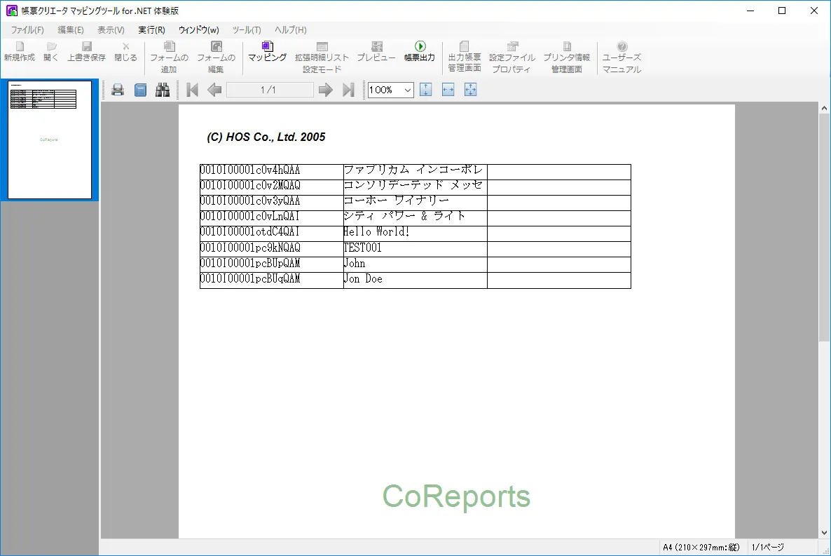 シーオーリポーツ 帳票クリエータは株式会社エイチ・オー・エスが提供する帳票作成ツールです。GUI ベースで各種データソースと紐付いた帳票を作成することが可能です。