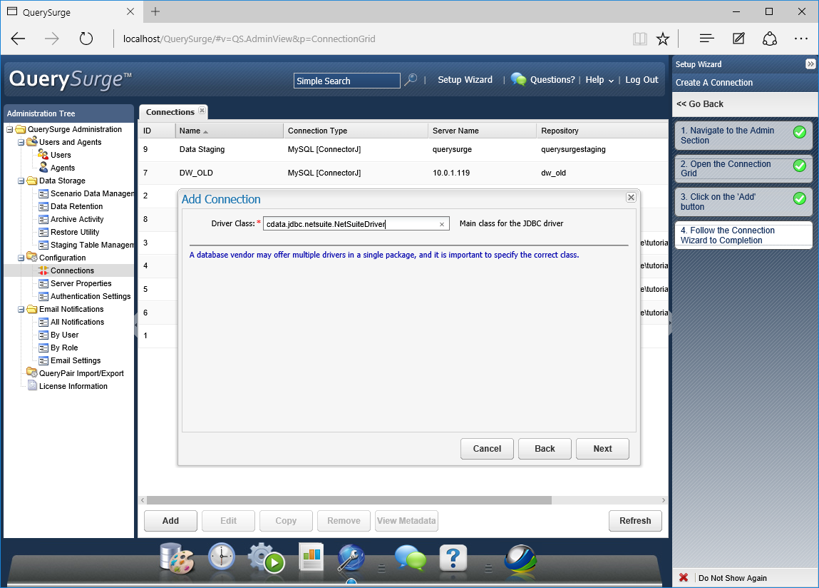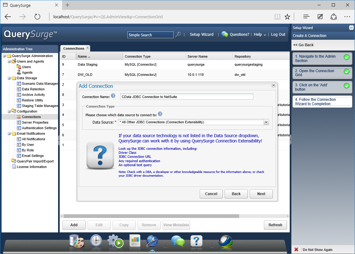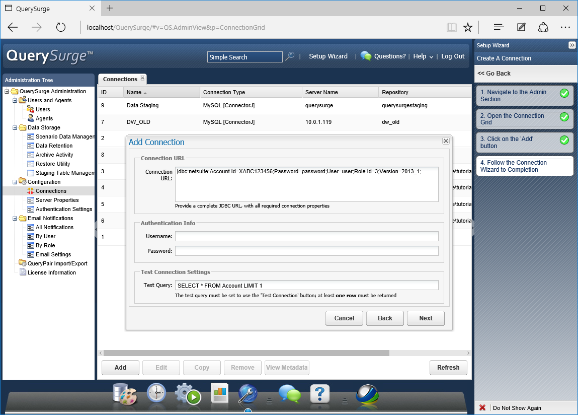 - QuerySurge Connection Wizard で Next をクリックします。