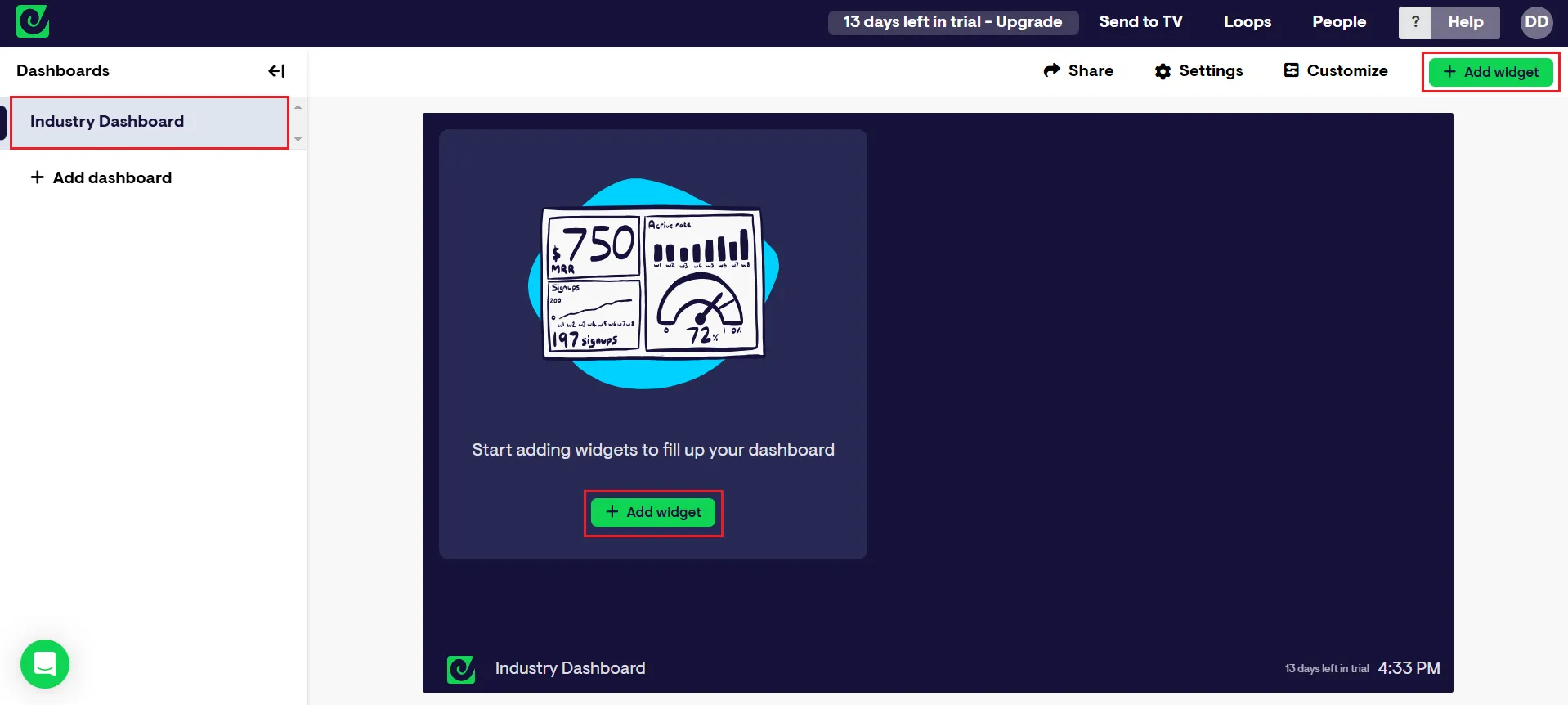 - カスタムダッシュボード名を追加し、Add widget をクリック