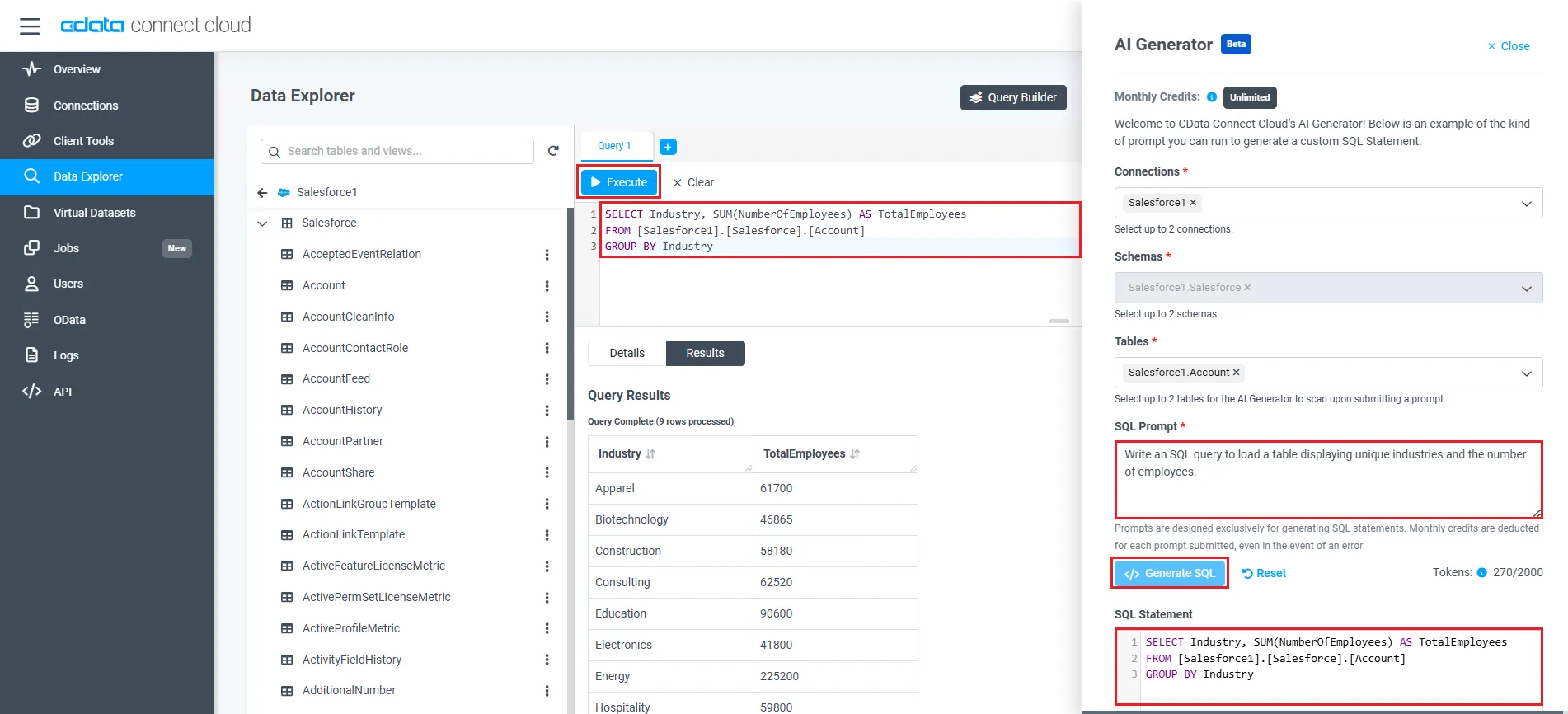 ユースケースに応じて、CData Connect AI の AI Generator または Query Builder 機能を使用して、必要な SQL クエリを生成することもできます