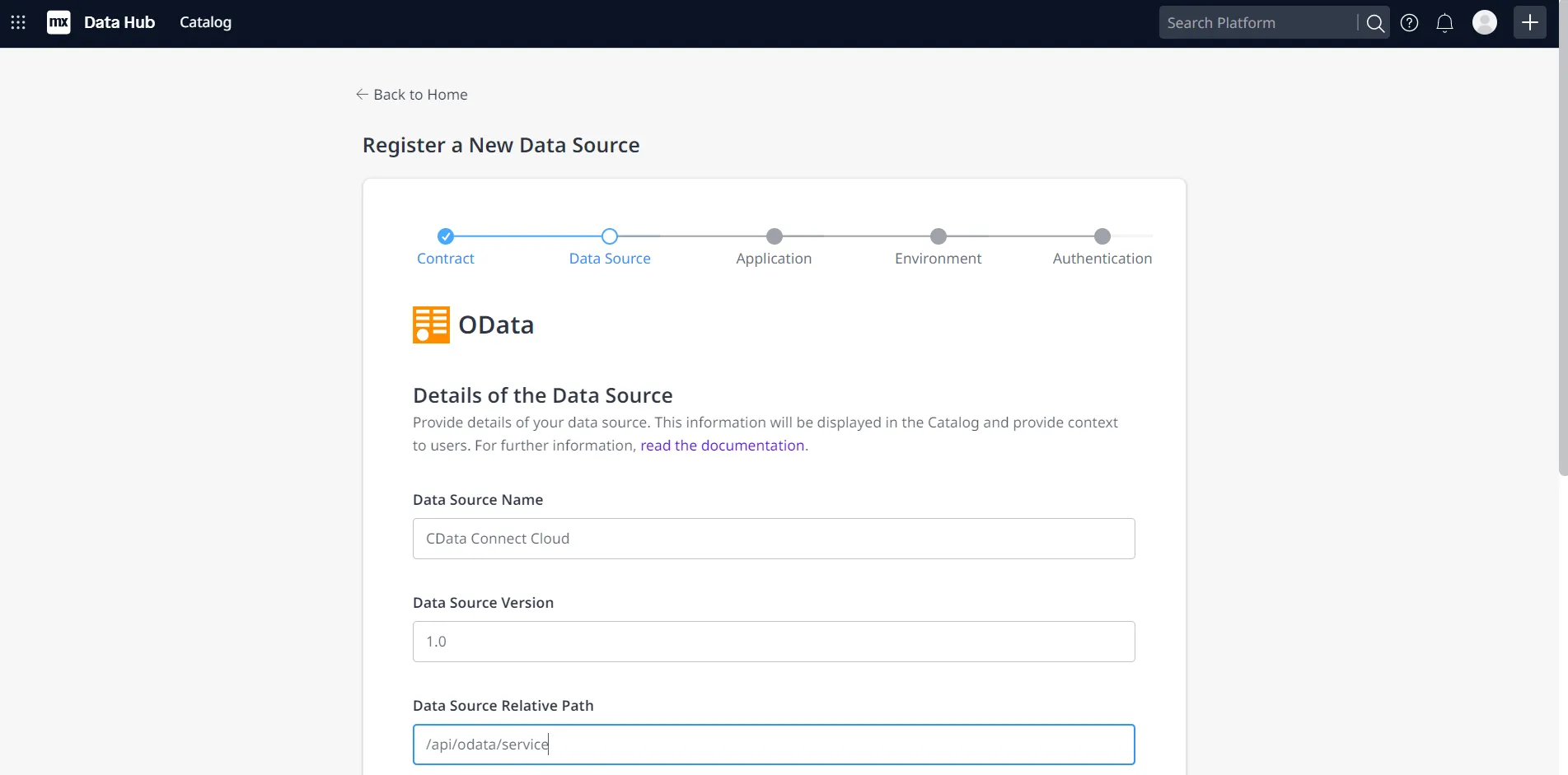 4. 「Data Source Name」と「Data Source Version」に希望する値を入力します。 「Data Source Relative Path」フィールドに「/api/odata/{workspace_name}」と入力し、「Next」をクリックします。