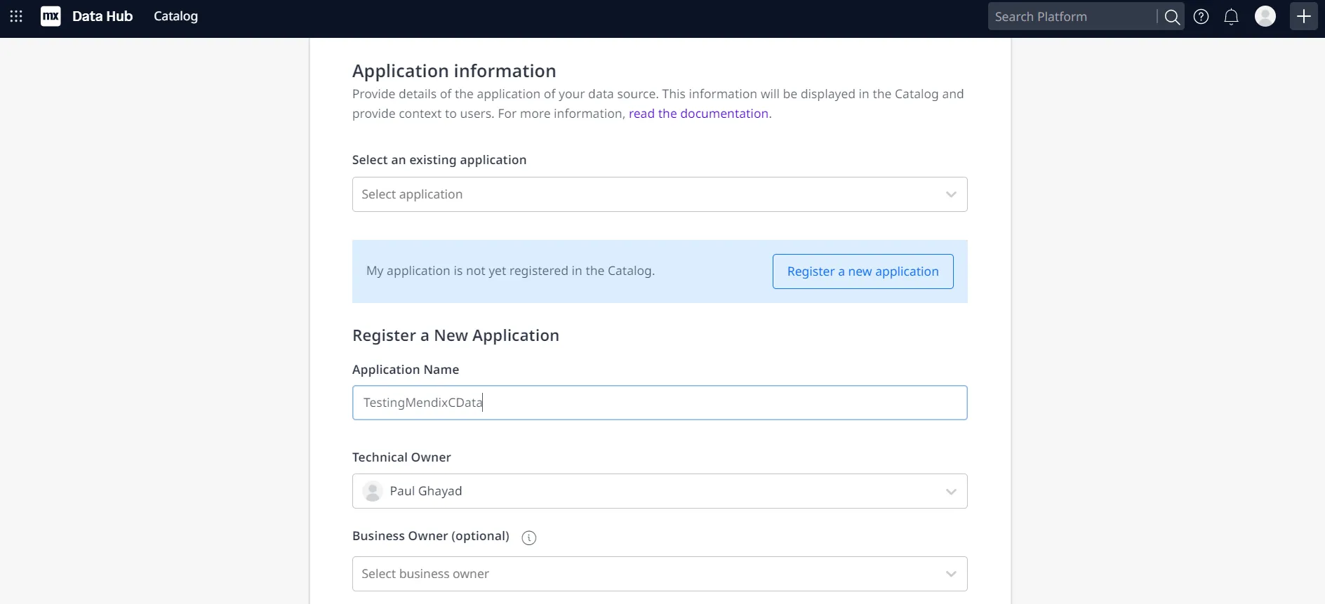 6. 「Application Name」に名前を入力し、テクニカルオーナーを選択します(デフォルトでは現在ログインしているユーザーになります)。