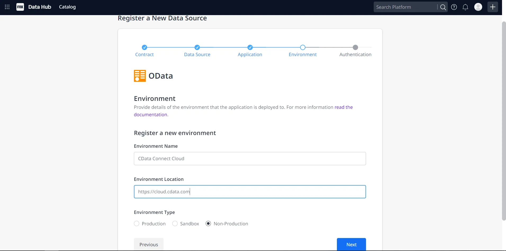 7. 「Next」をクリックします。「Environment Name」フィールドに希望する名前を入力します(例:CData Connect AI)。 「Environment Location」フィールドに「https://cloud.cdata.com」と入力し、必要に応じて適切な「Environment Type」(例:Production)を選択します。
