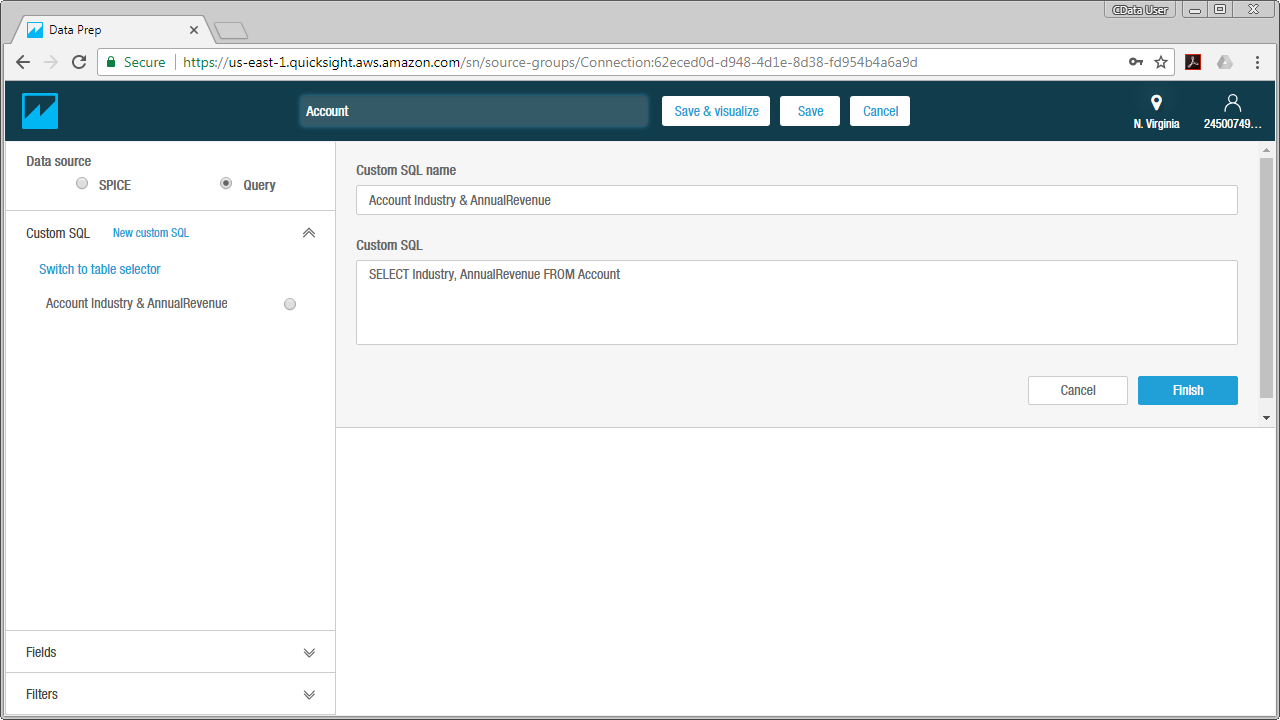 - データを QuickSight SPICE にインポートする場合は SPICE オプションをクリックします。そうでない場合は、QuickSight がデータを直接クエリします。