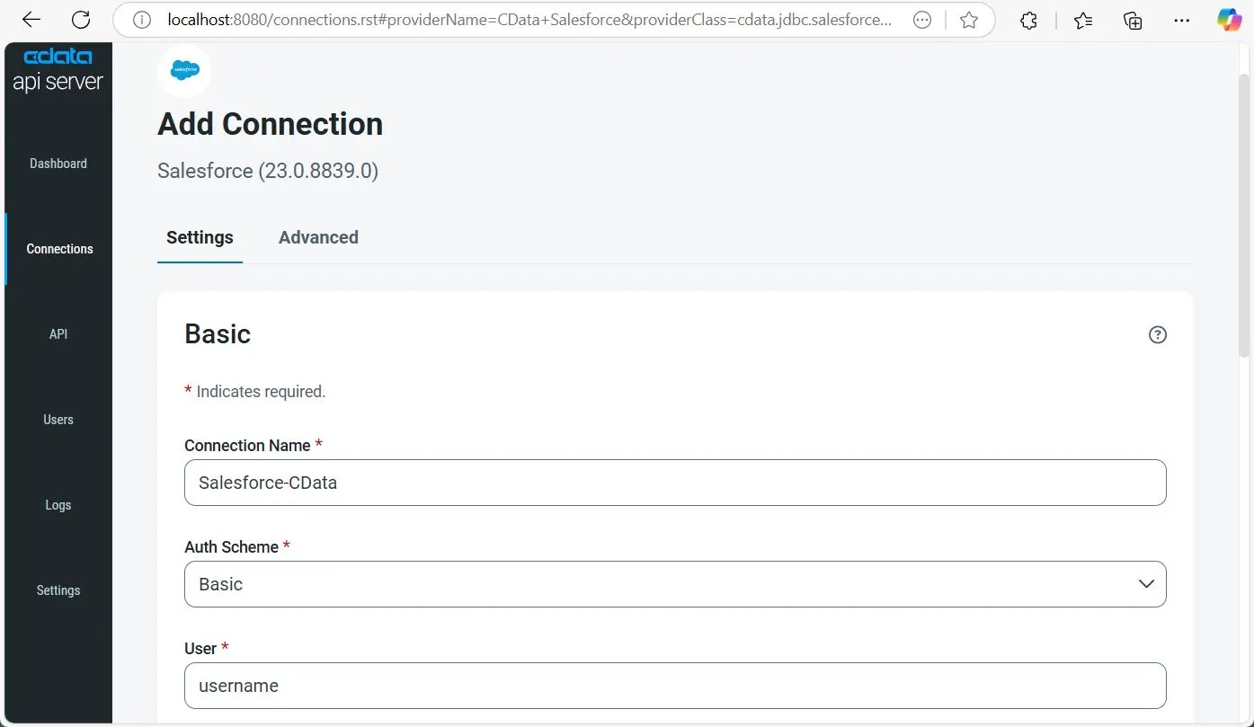 - CData API Server で作成したユーザーの Username と Password または Auth Token を入力します。「Add」をクリックし、次に「Add Data Source」をクリックして完了します。