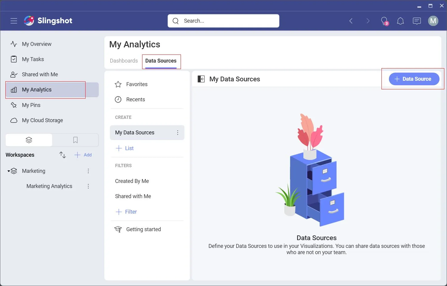 - 左側のパネルで「My Analytics」に移動します。上部の「Data Source」をクリックし、右上の Data Source をクリックします。
