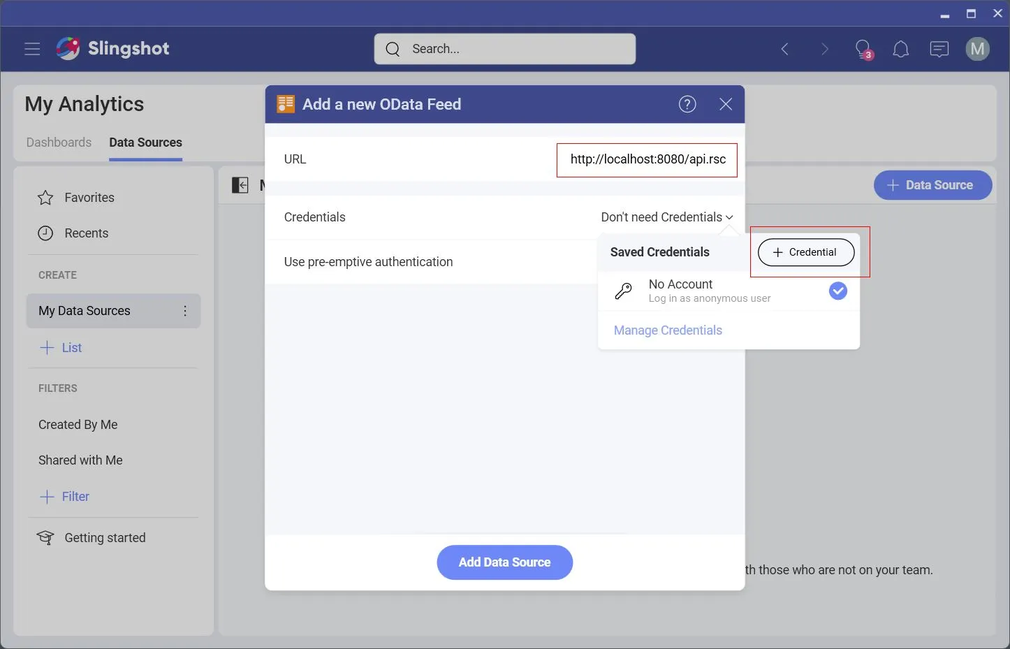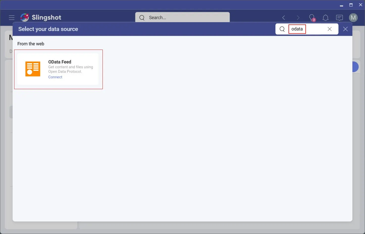 これらの OData エンドポイントは、URL を使用して新しいデータソースを作成することで Slingshot で直接利用できるようになりました。Slingshot は OData をサポートしているため、接続後は Microsoft Teams からのライブデータを使用してダッシュボードやビジュアライゼーションを構築できます。