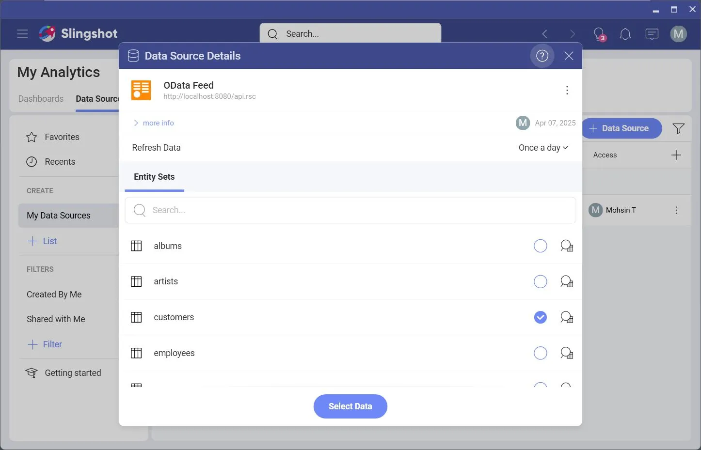 - 接続された OData Feed をクリックし、目的のテーブルを選択して「Select Data」をクリックして分析を開始します。