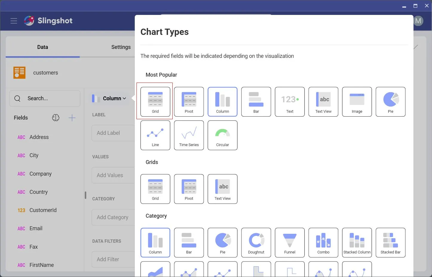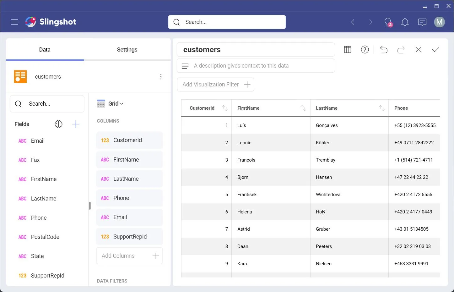 - テーブルから目的のカラムを Grid にドラッグ&ドロップします。Slingshot はそれらのフィールドを使用してライブデータビューを自動的に作成します。