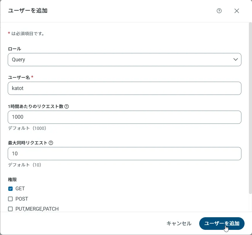 - 「Users」ページで ユーザーを追加をクリックすると、「ユーザーを追加」ポップアップが開きます。