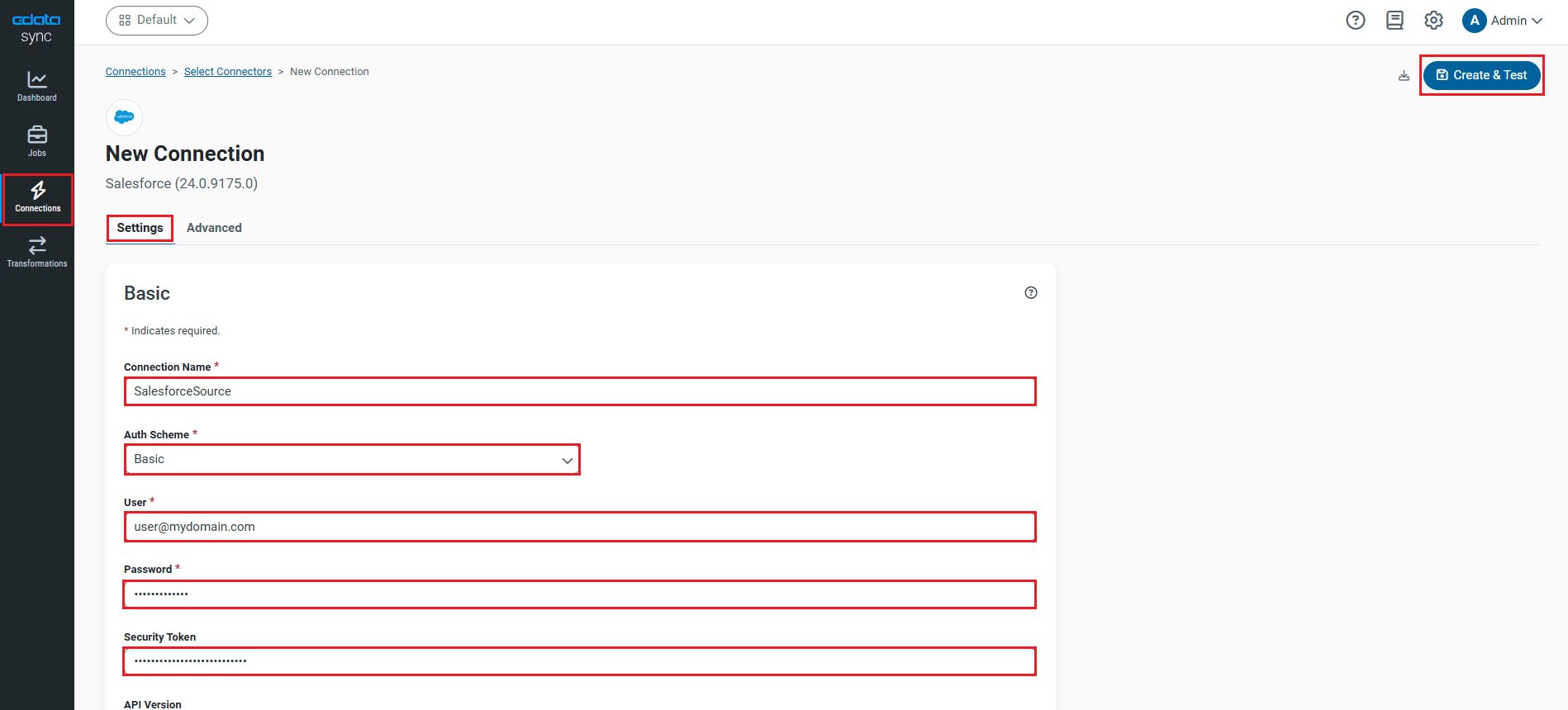 - 接続が確立されたら、作成およびテストをクリックして接続を作成、テスト、保存します。