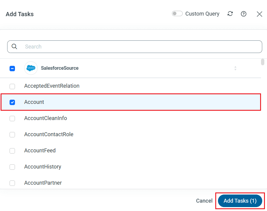 テーブル全体をレプリケーションするには、ジョブのタスクタブでタスクを追加をクリックし、Teradata にレプリケーションしたい Outreach.io テーブルをリストから選択して、再度タスクを追加をクリックします。
