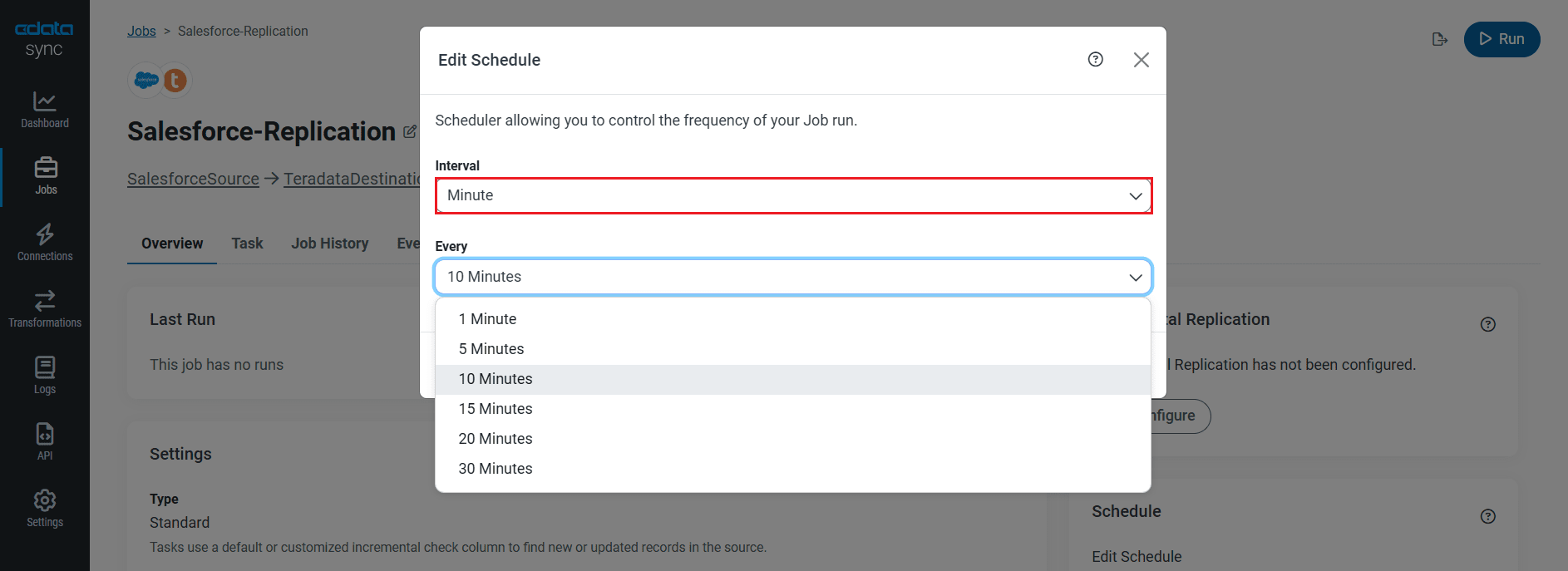ジョブの概要タブを選択し、スケジュールの下にある設定をクリックします。10分ごとから月1回まで、指定した間隔でジョブを自動実行するようにスケジュールできます。