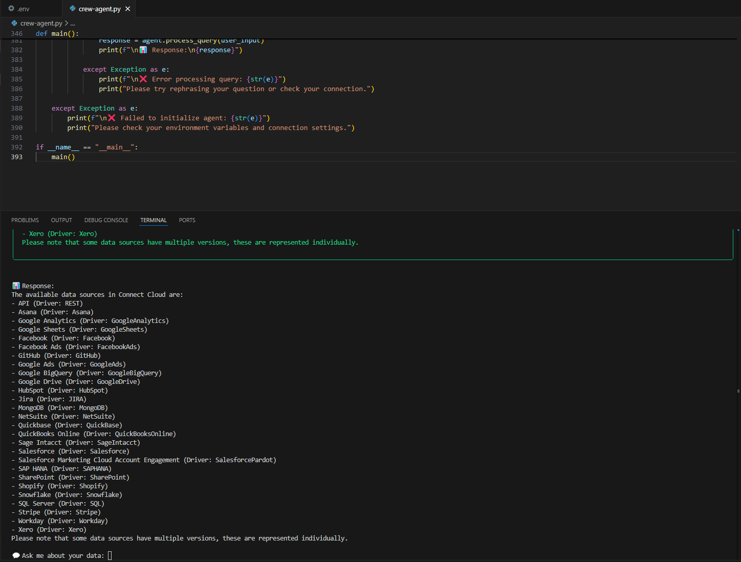 このPython スクリプトは、CData Connect AI の MCP (Model Context Protocol) Server に接続するインテリジェントな CrewAI エージェントを作成します。このエージェントは、接続されたデータソースと対話するための自然言語インターフェースを提供し、SQL を書くことなくデータベースのクエリ、スキーマの探索、ストアドプロシージャの実行が可能になります。