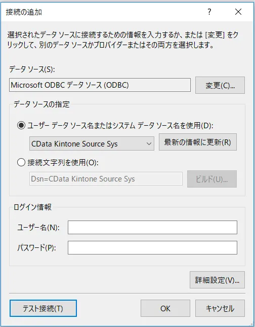 ODBC 接続プロパティの指定がまだの場合は、DSN (データソース名)で接続設定を行います。Microsoft ODBC データソースアドミニストレーターを使ってODBC DSN を作成および設定できます。ODBC ドライバーのインストール完了時にODBC DSN 設定画面が立ち上がります。 Microsoft ODBC データソースアドミニストレーターを開いて設定を行うことも可能です。 必要なプロパティを設定する方法は、ヘルプドキュメントの「はじめに」をご参照ください。