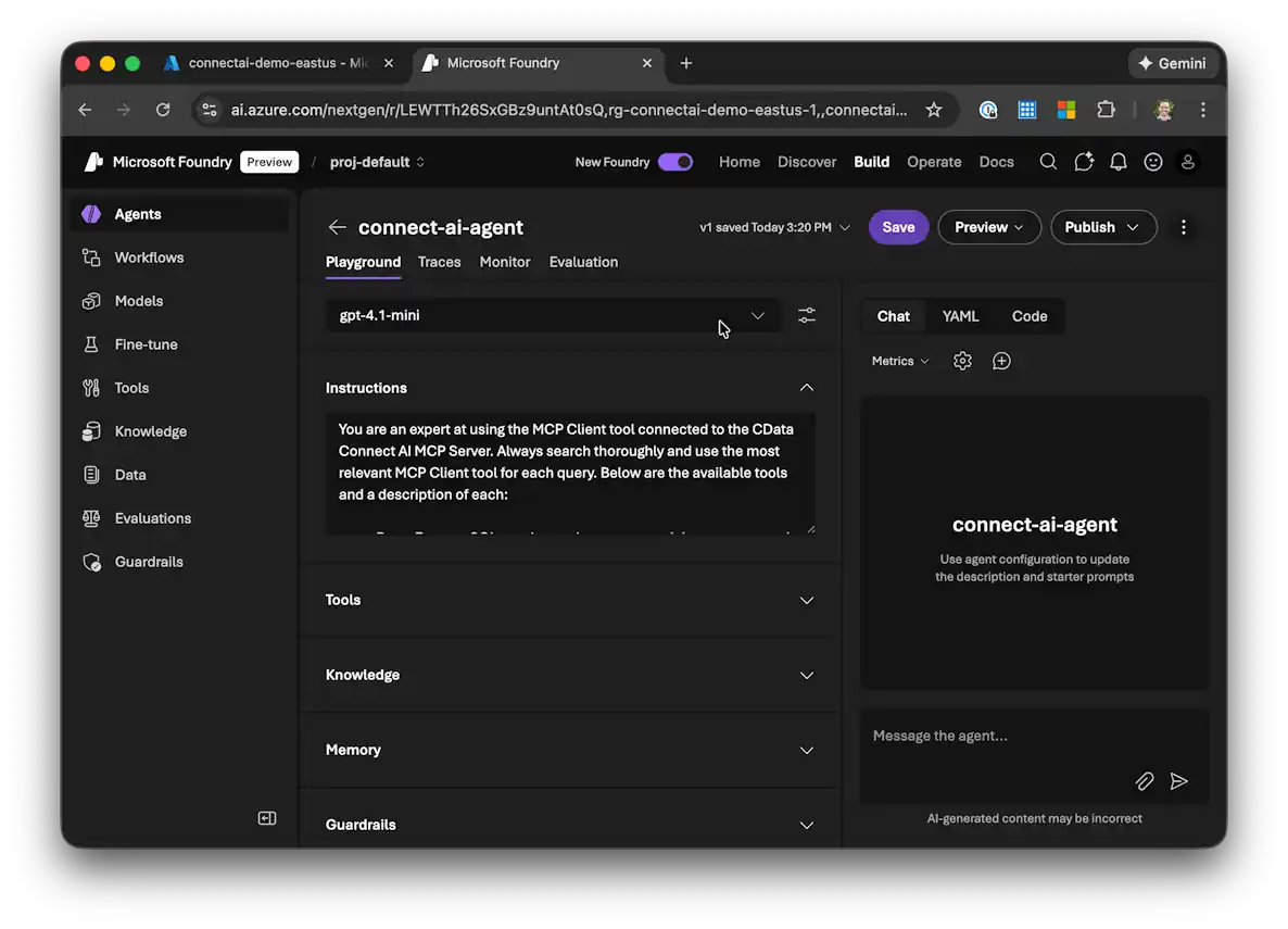 以下の手順に従って、AI エージェントを作成し、CData Connect AI に接続します:
