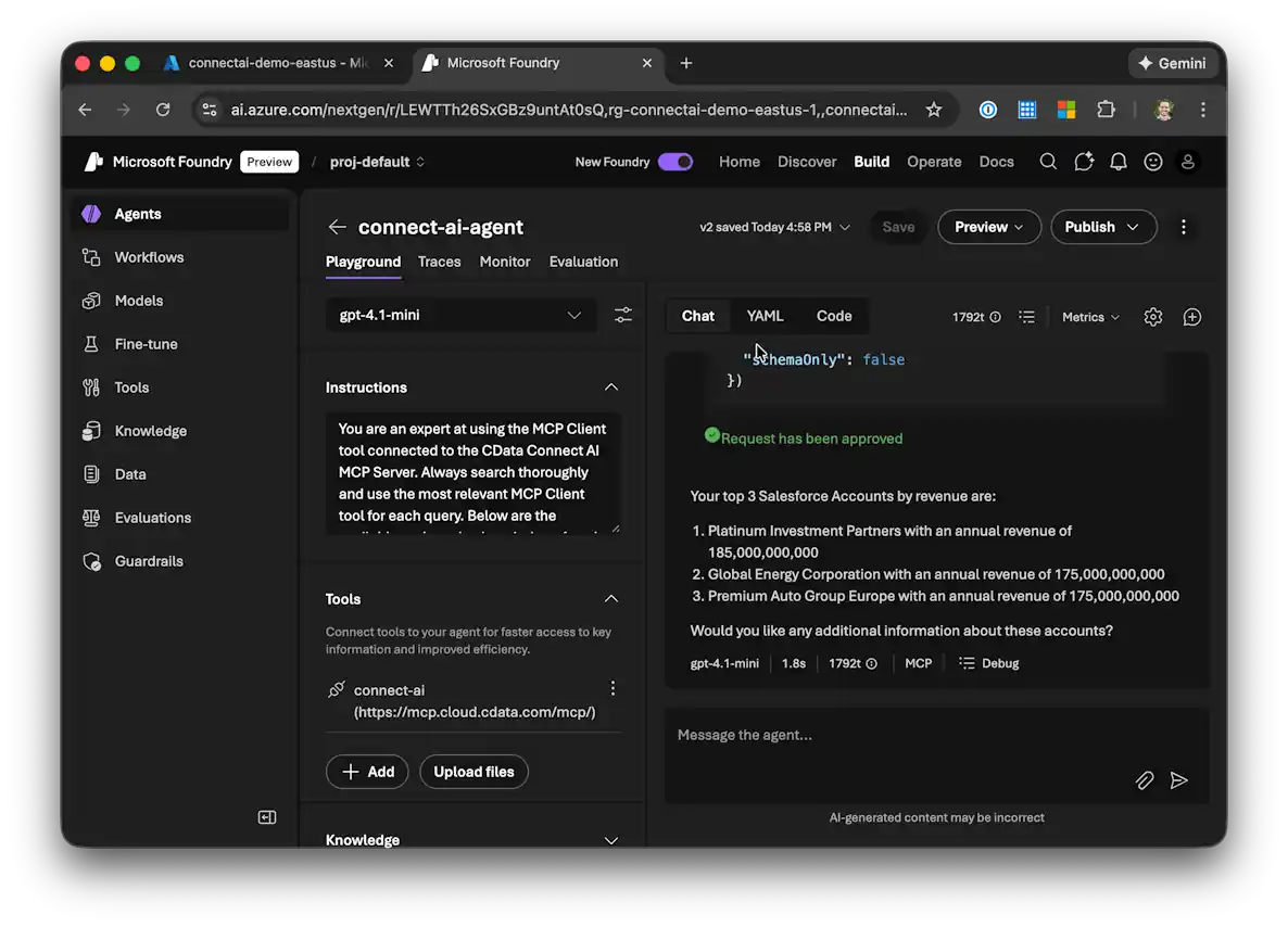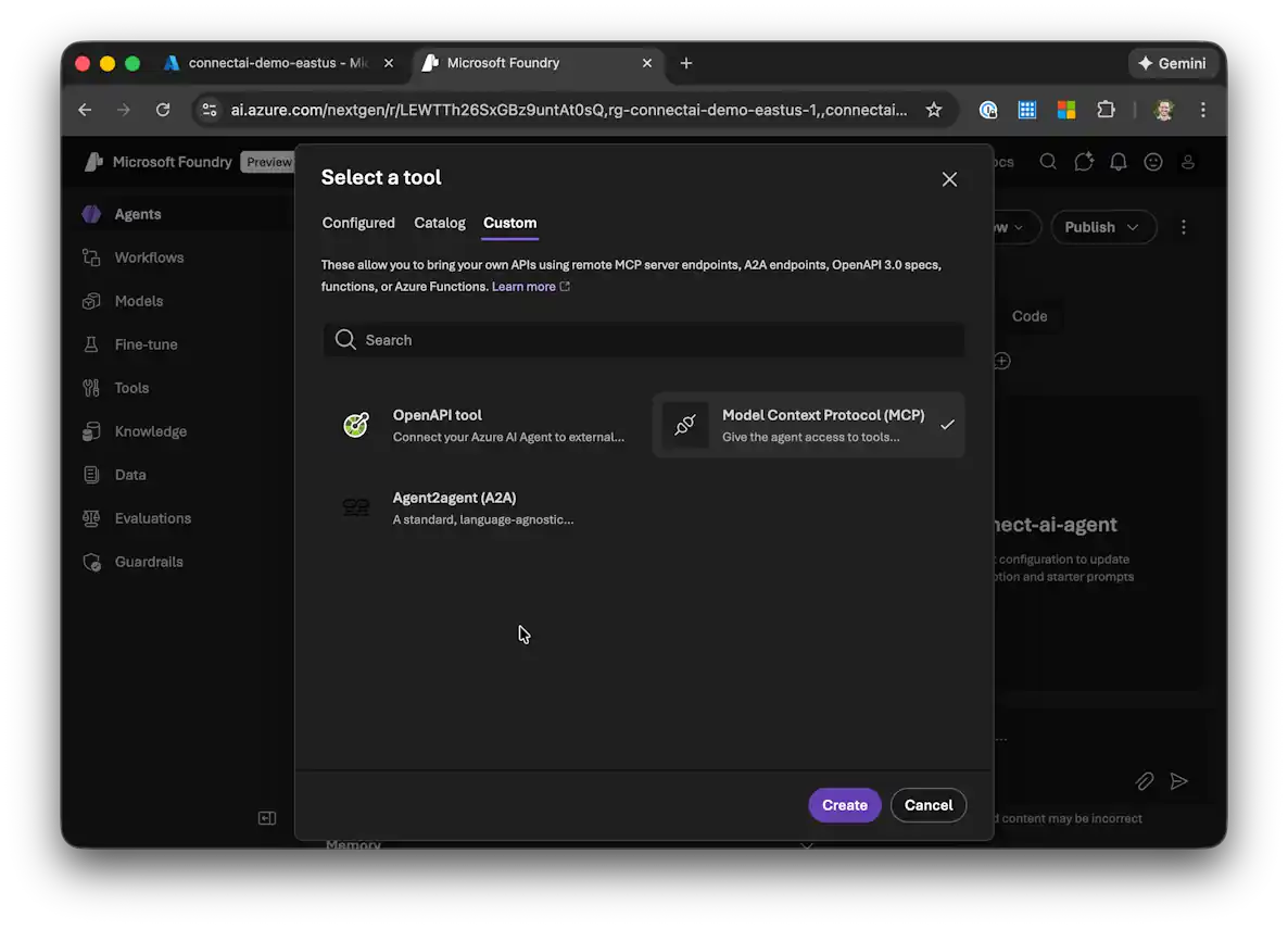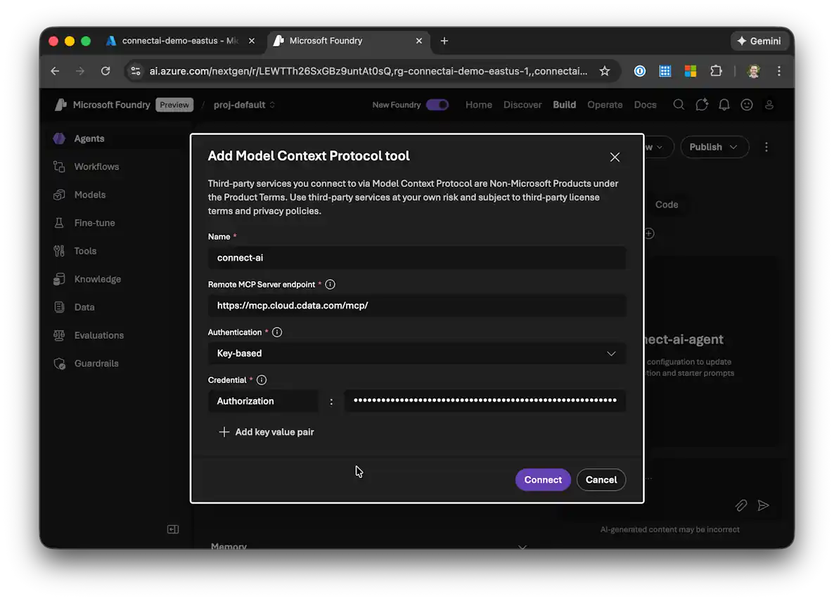 次に、CData Connect AI MCP Server をエージェントのカスタムツールとして追加します: