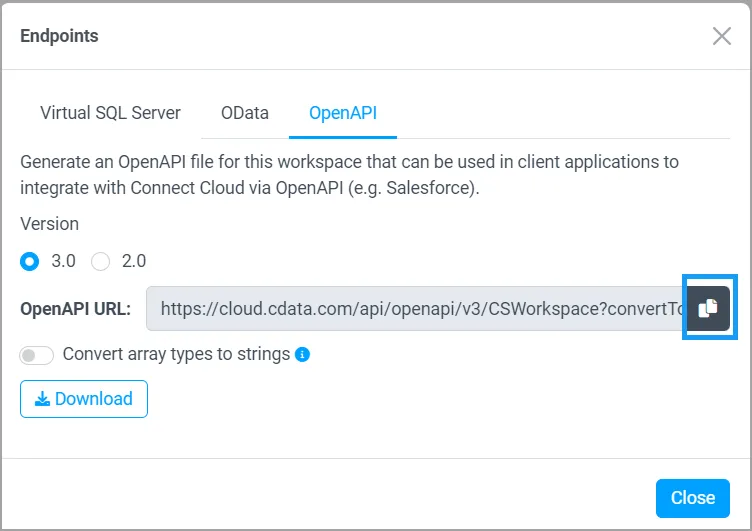 - ワークスペースのOpenAPI URL またはVirtual SQL Server URL をメモしておきます。例:https://cloud.cdata.com/api/openapi/v3/{workspace_name}...