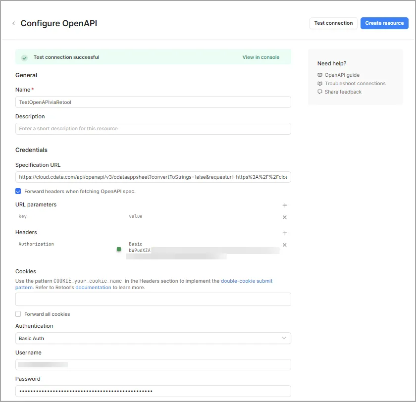 - Basic 接続値について、Retool はCData Connect AI のusername:PAT の組み合わせをBase64 エンコードしたバージョンを必要とします(PAT は先ほど生成したトークンです)。こちらのようなツールを使用して値をエンコードしてください。例えば、test@cdata.com:12345 はdGVzdEBjZGF0YS5TIzNDU= にエンコードされます。このエンコードされた値をコピーして、Basic の後にスペースを入れてvalue フィールドに貼り付けます。