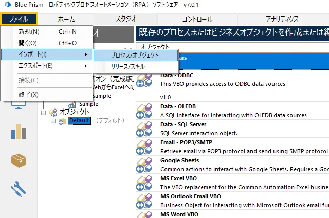 - 「BPA+Object+-+Data+-+ODBC+v1.0.xml」というXMLファイルがダウンロードできるので、Blue Prism を立ち上げてオブジェクトとしてインポートしましょう。