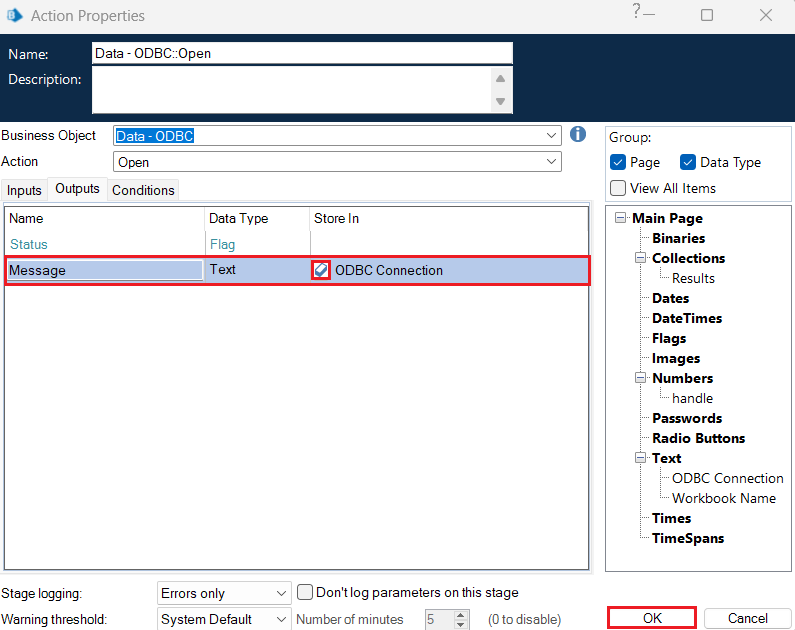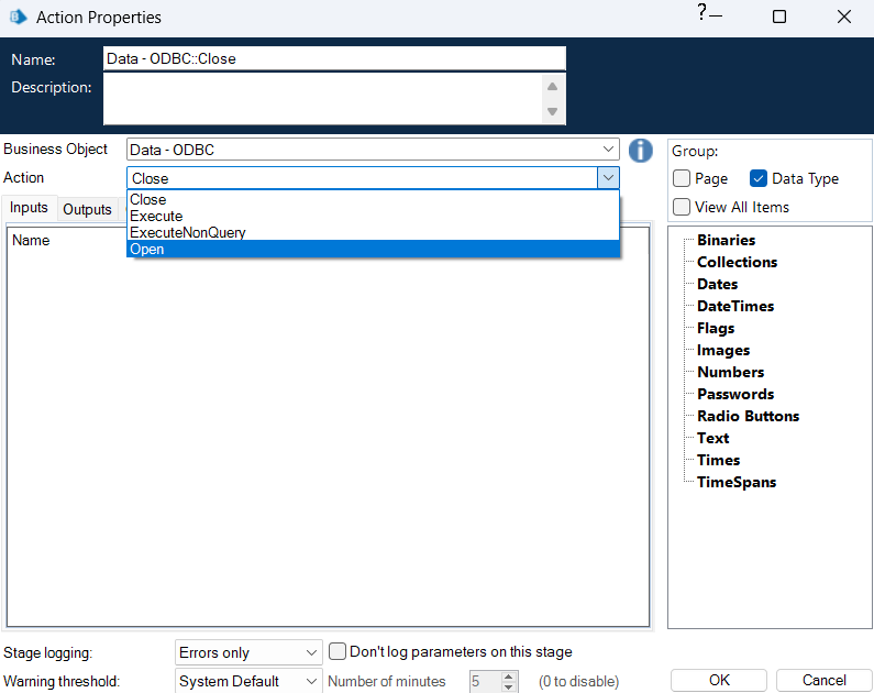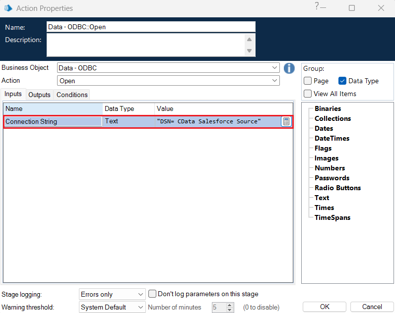 - ビジネスオブジェクトの一覧から先ほどインポートした「Data - ODBC」を選択しアクションの一覧で「Open」を選択しましょう。 「Open」アクションは入力パラメータとして「Connection String」を必要とします。ここで先ほど設定したCData ODBC ドライバのDSN 名を「"DSN=CData Reckon Source"」といった形式で指定します。