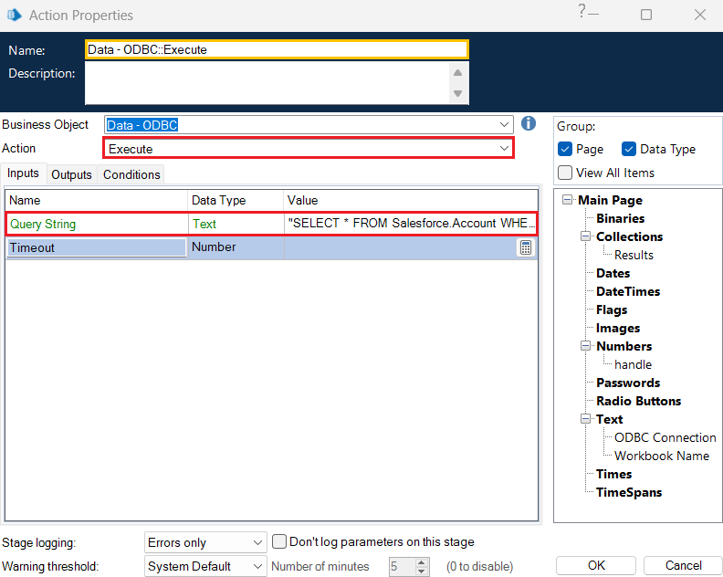 - ビジネスオブジェクトの一覧から「Data - ODBC」を選択、アクションの一覧で「Execute」を選択しましょう。Execute ではSQL を指定して、データを取得することができます。