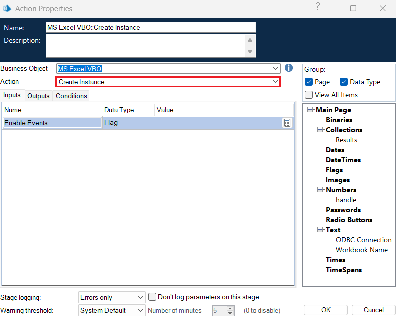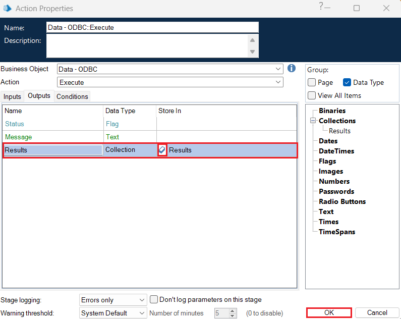 - 「MS Excel VBO::Write Collection」のアクションで入力パラメータの「Collection」にODBC 経由で取得した「Results」を書き込んでいます。